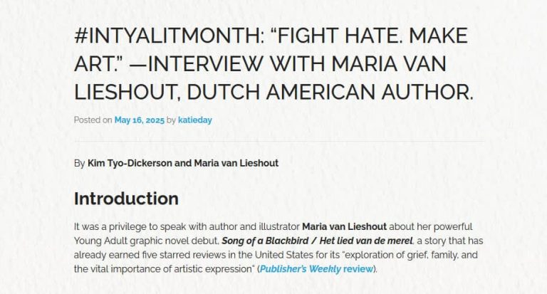 Kim Tyo-Dickerson: Thank you so much for speaking with me about Song of a Blackbird for the Global Literature in Libraries Initiative’s fifth annual International Young Adult Literature Month! It’s fascinating to learn more about how your family history, and some surprising discoveries in your grandparents’ home in Amsterdam, helped inspire this powerful story, especially the connection to the Dutch resistance during World War II. That hidden past clearly shaped your moving exploration of how art and survival are intertwined.