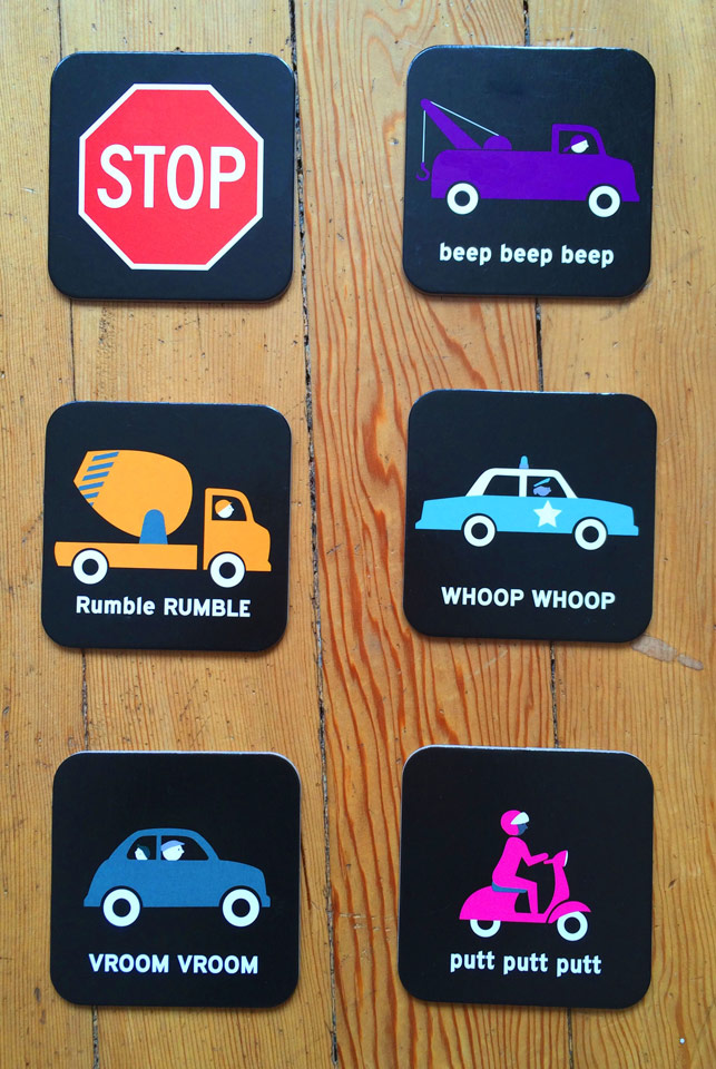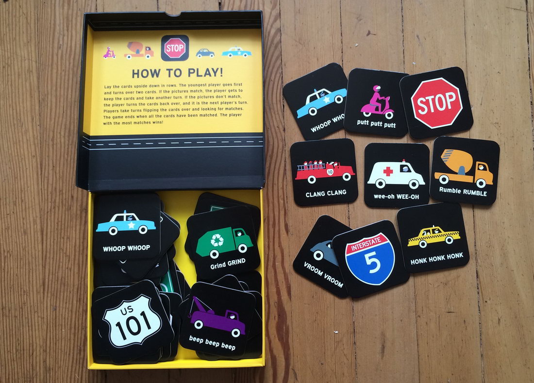 Simple, brightly colored pictures of familiar vehicles and traffic signs will engage young minds and develop identification, memory and pattern skills.